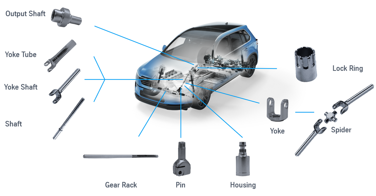 Vehicle steering is a highly complex system that places the highest demands on safety, precision and driving comfort. Our cold forged parts are used in the steering column and in the inner steering train. These parts, such as yokes, shafts and spiders, are manufactured in net-shape quality, which means they are ready for immediate use without the need for machining.